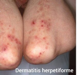 Es una erupción cutánea muy poco frecuente ,que se caracteriza por la presncia de pápulas, ampollas, vesículas y costras que aparecen usualmente en los codos, las rodillas, la espalda y los glúteos. Es simétrica y muy pruriginosa.
